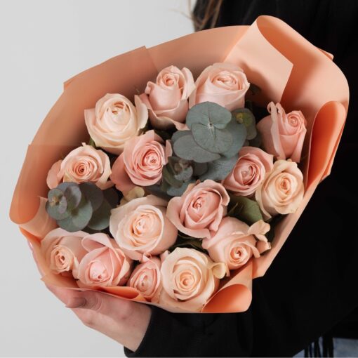 Элегантный букет из 15 розовых роз (эквадорская роза), дополненный эвкалиптом. Классические розы в сочетании с зеленью создают легкую, стильную и универсальную композицию. Подходит для подарка или украшения интерьера.
