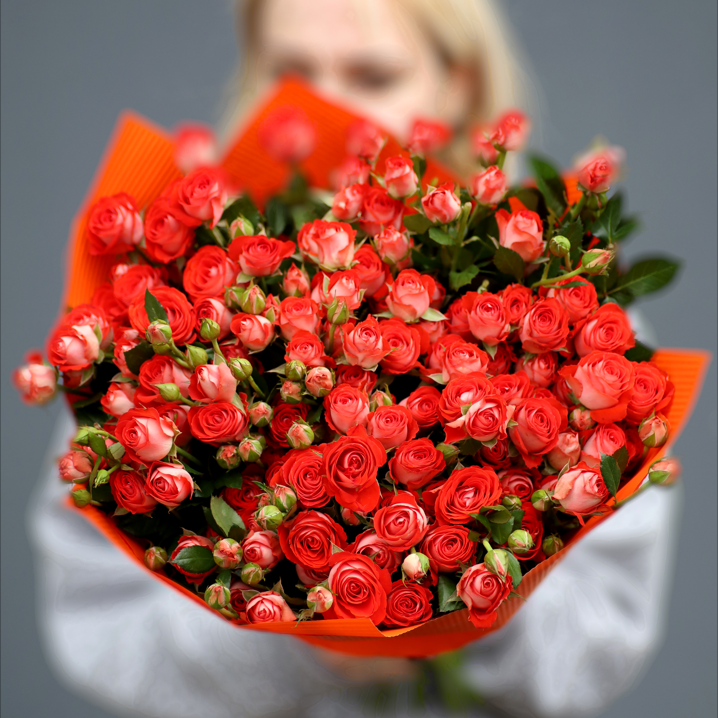 Букет из кустовых роз собирается из доступных на момент заказа цветов разных оттенков и сортов.