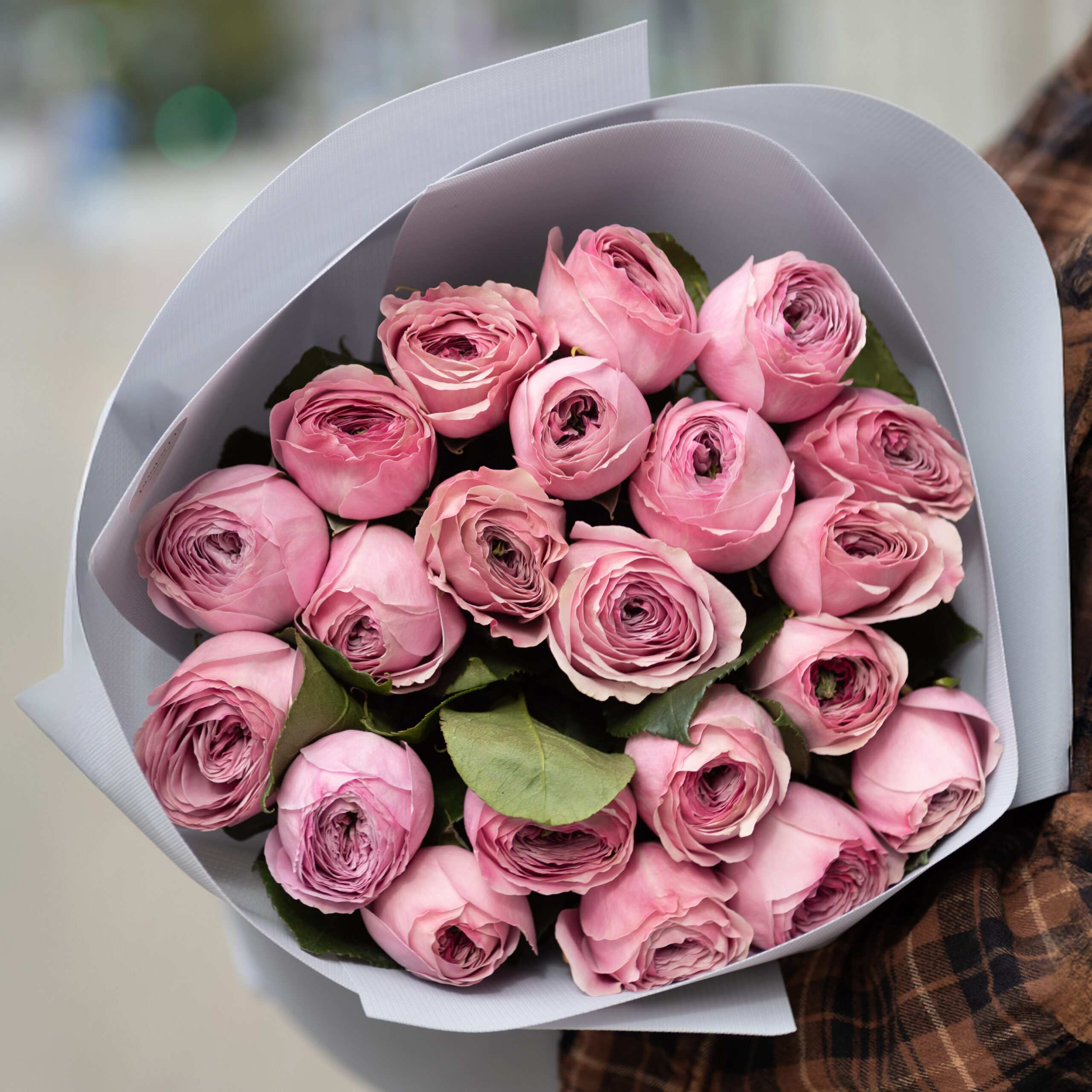 Букет из 21 эквадорской розы сорта Pione Kiss с крупными пионовидными бутонами нежно-розового оттенка.