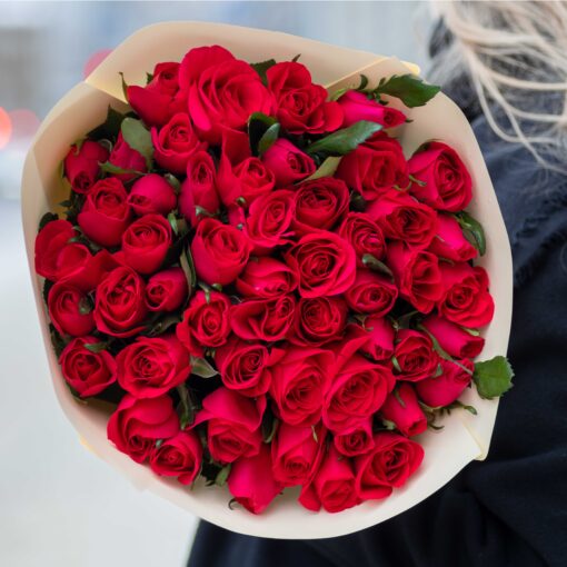 Шикарный классический букет из 51 свежей розы высотой 35–50 см.