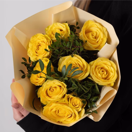 Букет из 9 желтых роз (эквадорская роза), дополненный декоративной зеленью. Яркая и универсальная композиция, подходящая для подарка, знака внимания или украшения интерьера.