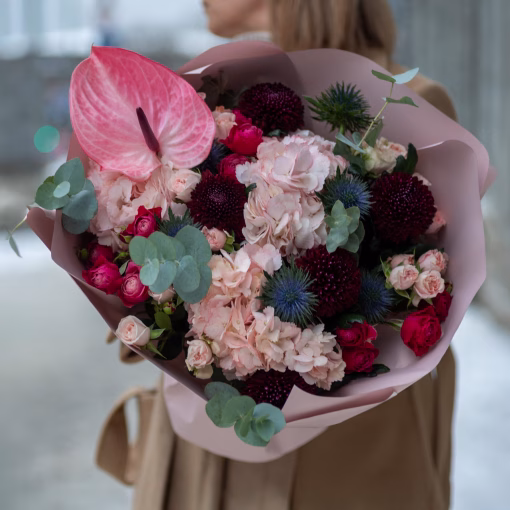 Составной букет с мягкой цветовой палитрой и гармоничным сочетанием оттенков — элегантный вариант для подарка и особых случаев.