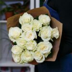 Классический букет из 15 белых роз, высота 50 см. К каждому букету прикладываем открытку в подарок и средство, продлевающее жизнь розам. Рекомендуемое количество пакетиков для продления жизни букета — 2 штук