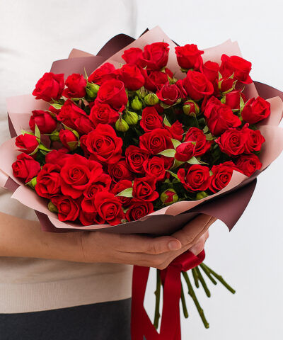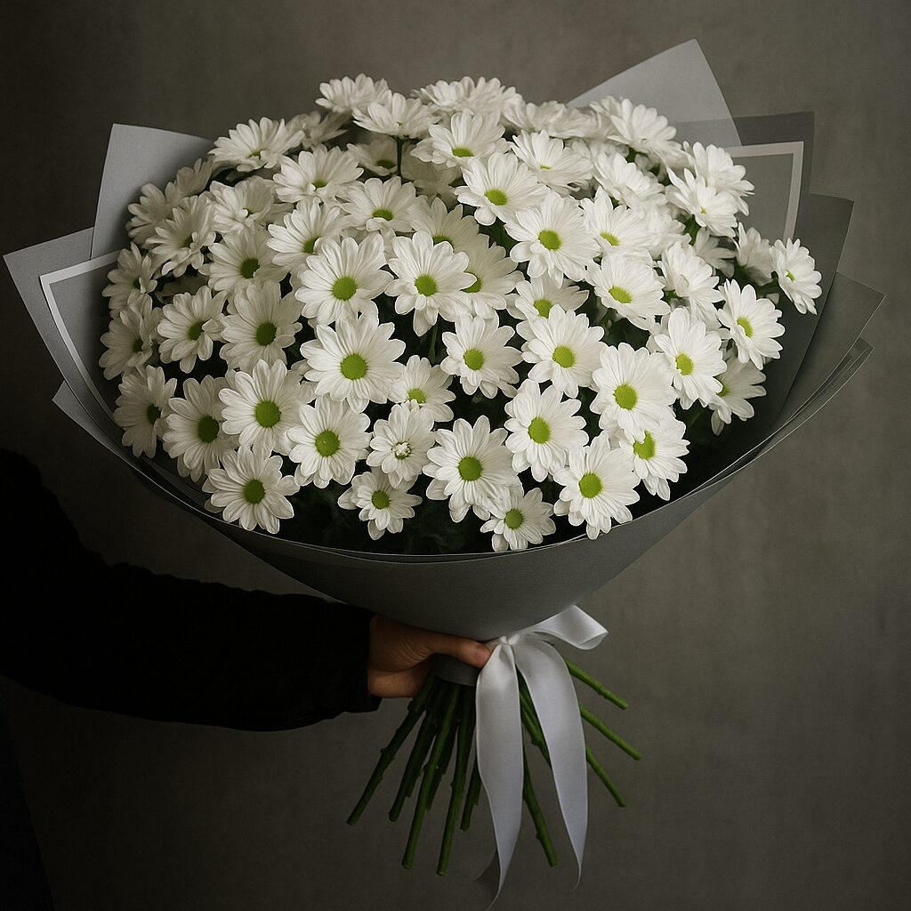 Букет из 15 хризантем кустовых в стильной упаковке. Сорта хризантем и цвет могут быть разными. К каждому букеты мы прикладываем бесплатную открытку и специальное средство, продлевающее жизнь цветам и облегчающее уход за ними.