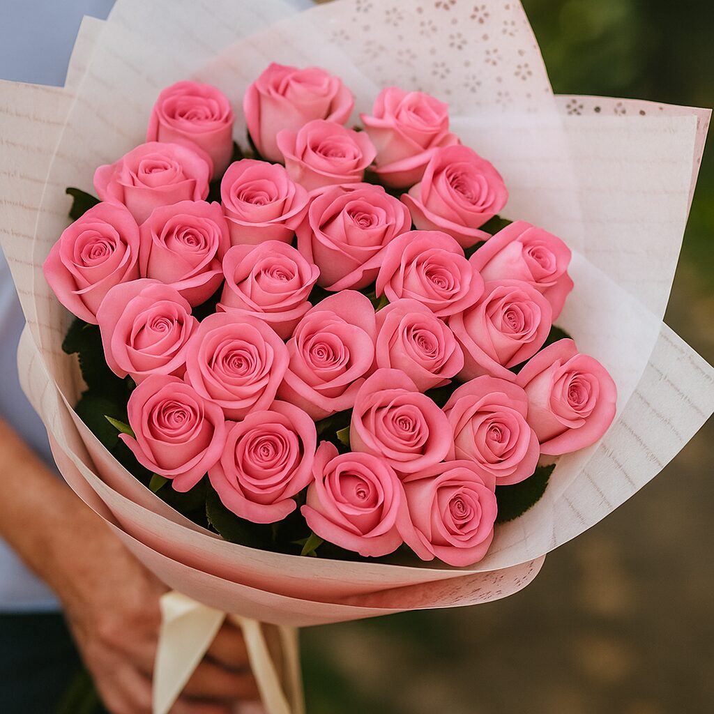 Классический букет из 25 розовой розы, высота 35-50 см. К каждому букету прикладываем открытку в подарок и средство, продлевающее жизнь розам. Рекомендуемое количество пакетиков средства по уходу за букетом — 3 штуки
