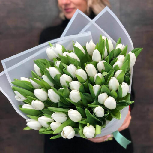 Нежный букет из 49 белых тюльпанов в стильной упаковке. К каждому нашему букеты мы прикладываем открытку и средство для продления жизни цветов.