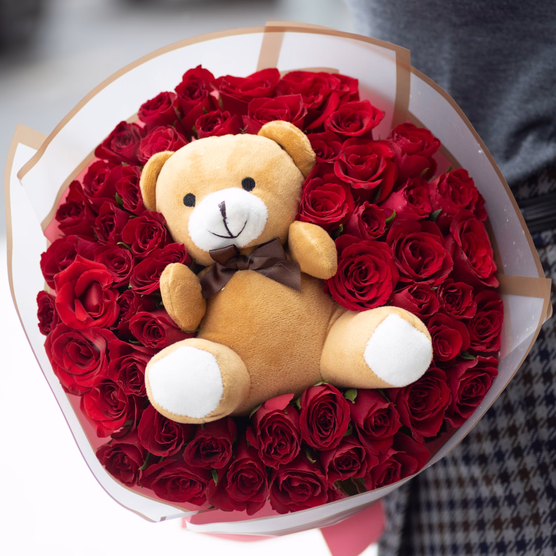 Внимание! Плюшевый мишка служит декоративной частью букета, а не отдельной игрушкой. Он не рассчитан на длительную эксплуатацию и может быть повреждён при разборке букета.