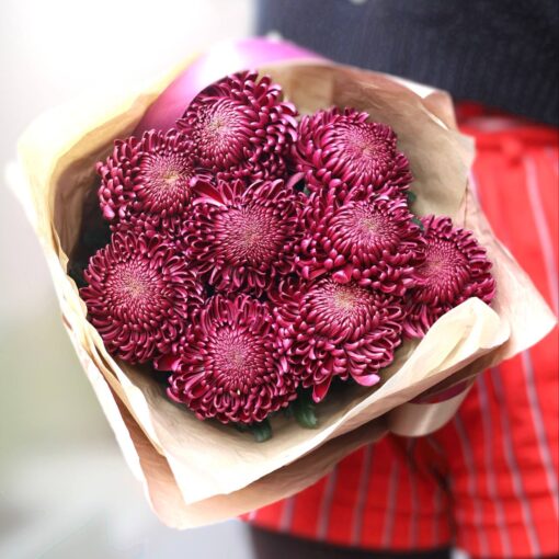 Букет из 9 хризантем в стильной упаковке. Сорта хризантем и цвет могут быть разными. К каждому букеты мы прикладываем бесплатную открытку и специальное средство, продлевающее жизнь цветам и облегчающее уход за ними.