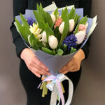 Букет из 11 тюльпанов  и 10 гиацинтов в стильной упаковке. К каждому нашему букеты мы прикладываем открытку и средство для продления жизни цветов