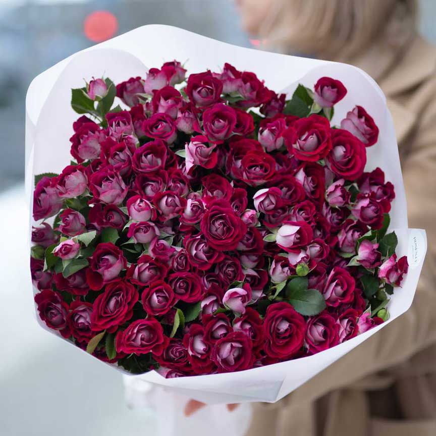Шикарный классический букет из фиолетовых кустовых роз, высота 35–50 см. К каждому букету мы прикладываем открытку в подарок и средство, продлевающее жизнь розам. Рекомендуемое количество пакетиков средства по уходу за букетом — 3 штуки.