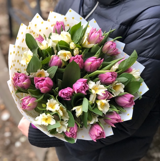 Букет из тюльпанов и нарциссов в стильной упаковке. К каждому нашему букеты мы прикладываем открытку и средство для продления жизни цветов.