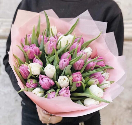 Букет из 35 пионовидных тюльпанов в стильной упаковке. К каждому нашему букеты мы прикладываем открытку и средство для продления жизни цветов