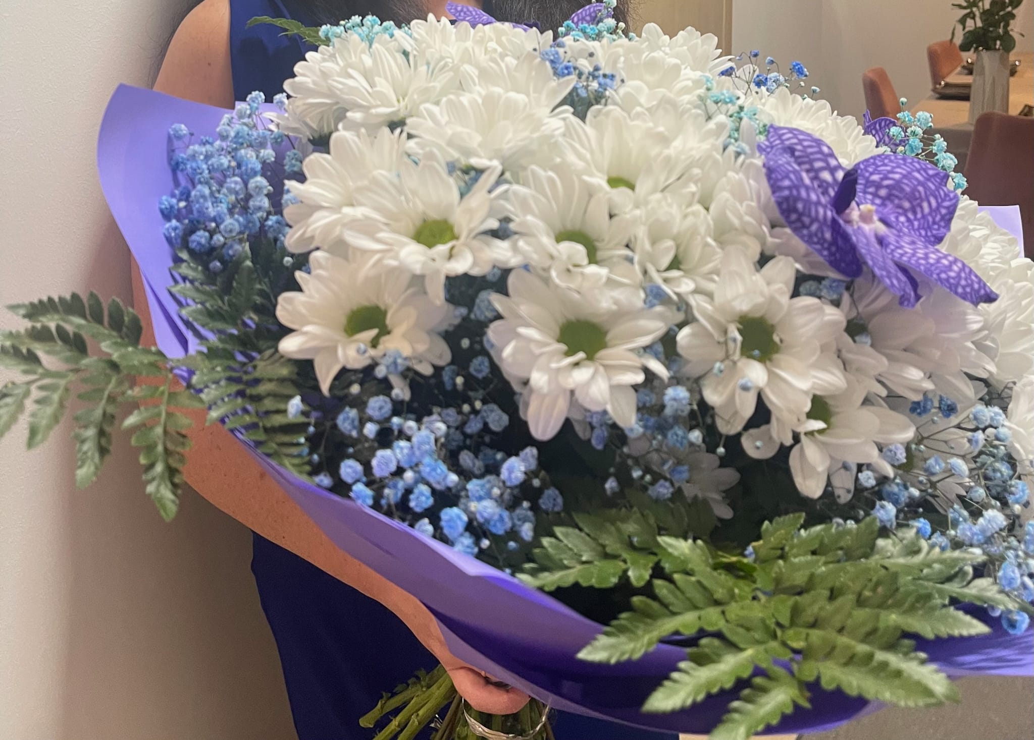 букет из кустовой хизантемы, ирисов, цветного гипсофила, писташи или эфкалипта (sp)