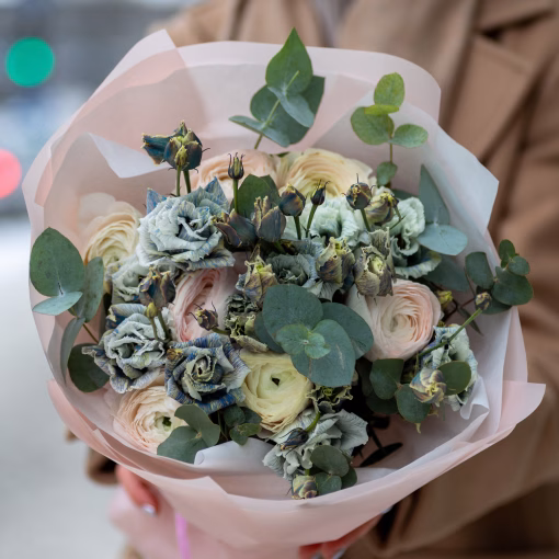 Букет из ранункулюсов, эустомы и эвкалипта — нежный и современный вариант для подарка и особых случаев.