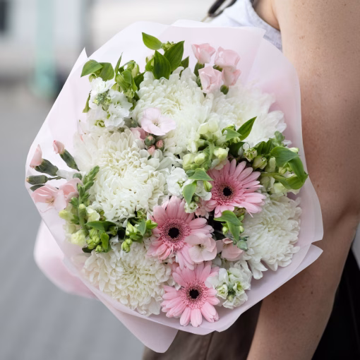 Сезонный букет из разных цветов. Количество стеблей цветов 17 шт, цветовая гамма может быть разной. Фотография для примера – собираем из имеющихся в наличие сезонных цветов. В комментарии при заказе укажите какой именно вы хотите букет: яркий или нежный. В любом случае, он будет стильным и выполнен из свежих цветов.