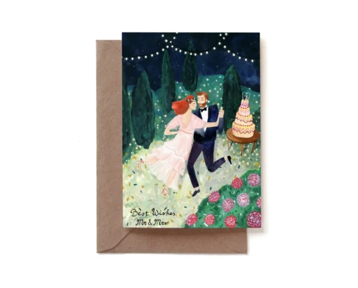 Дизайн: первый танец молодоженов. Двойная открытка, отпечатана в Амстердаме на премиальной переработанной бумаге с добавлением органического хлопка. В комплекте коричневый конверт; упаковка — пакет из переработанного пластика. Внутри пустая. Размер 10 × 15 см.