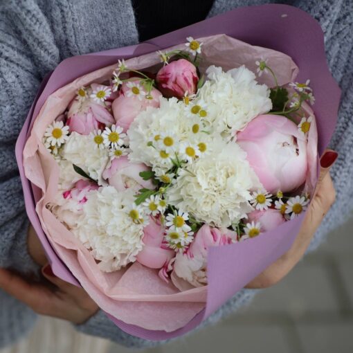 -35%Классический букет из пионов(7 шт), ромашки(3 шт) и диантуса(5) в стильной упаковке. К каждому букету прикладываем открытку в подарок и средство, продлевающее жизнь цветам. Рекомендуемое количество пакетиков для продления жизни букета — 5 штук.