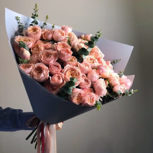 Шикарный букет из кустовых пионовидных роз и эвкалипта в стильной упаковке. К каждому букету мы прикладываем открытку бесплатно и средство, продлевающее жизнь цветам.